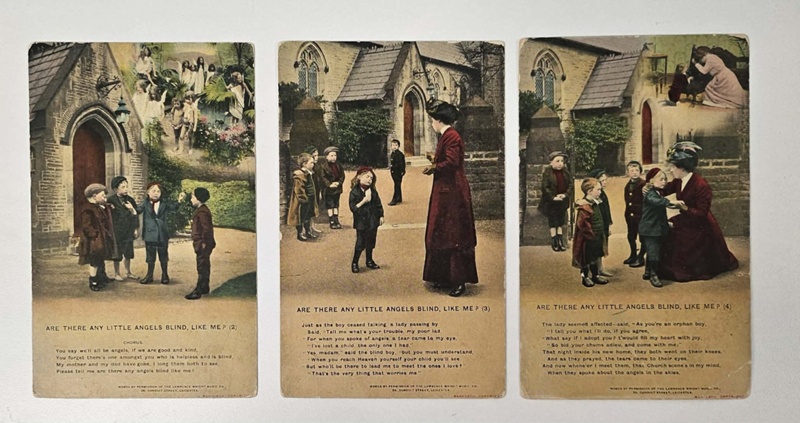Set’s include 'Are There Any Little Angels Blind, Like Me?' (4625 2/3/4), ‘When Irish Eyes are Smiling’(4802 1/2/3), ‘Sunshine and Roses' (4848 1/2/3), Laddie in Khaki (3), I’m Waiting Just to Tell You (3). These cards were never sent and are in good condition. The printing on the back is Art Nouveau in style.