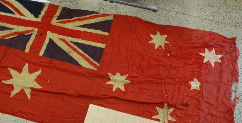 This Australian Red Ensign is estimated to date from around 1910. The flag features hand-stitched construction and exhibits signs of wear, fading, and patina consistent with historical use. An ink inventory mark/stamp appears on the internal hoist edge (the canvas binding) of the flag: “ST PAULS CATH…”, the remaining letters are faded or obscured by the fold and wear, and most likely means Cathedral. Thus, the flag's inventory mark is most likely referring to St Paul’s Cathedral, London or St Paul's Cathedral, Melbourne, where it would have been used for major services and national occasions.